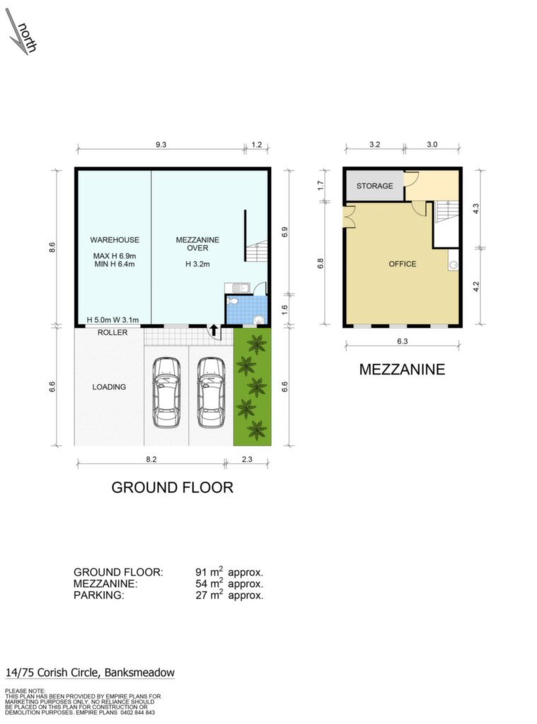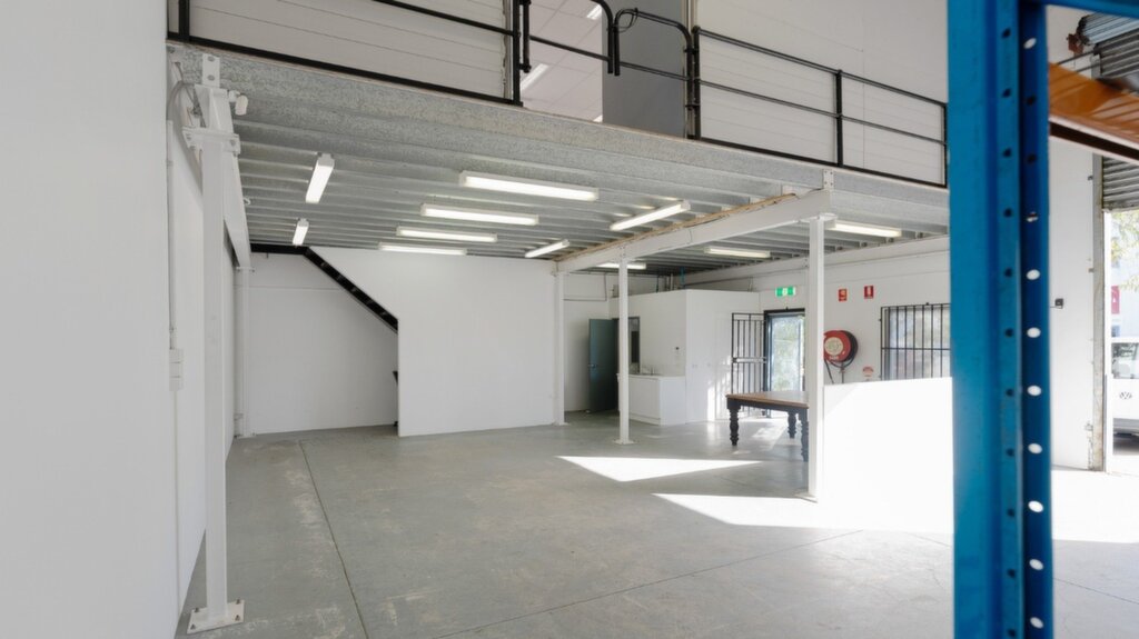 Total area approx. 145 sqm + 2 car spots Warehouse approx. 91 sqm + 54sqm Mezzanine office Air conditioned office Security gated estate Good truck access High clearance roller door entry