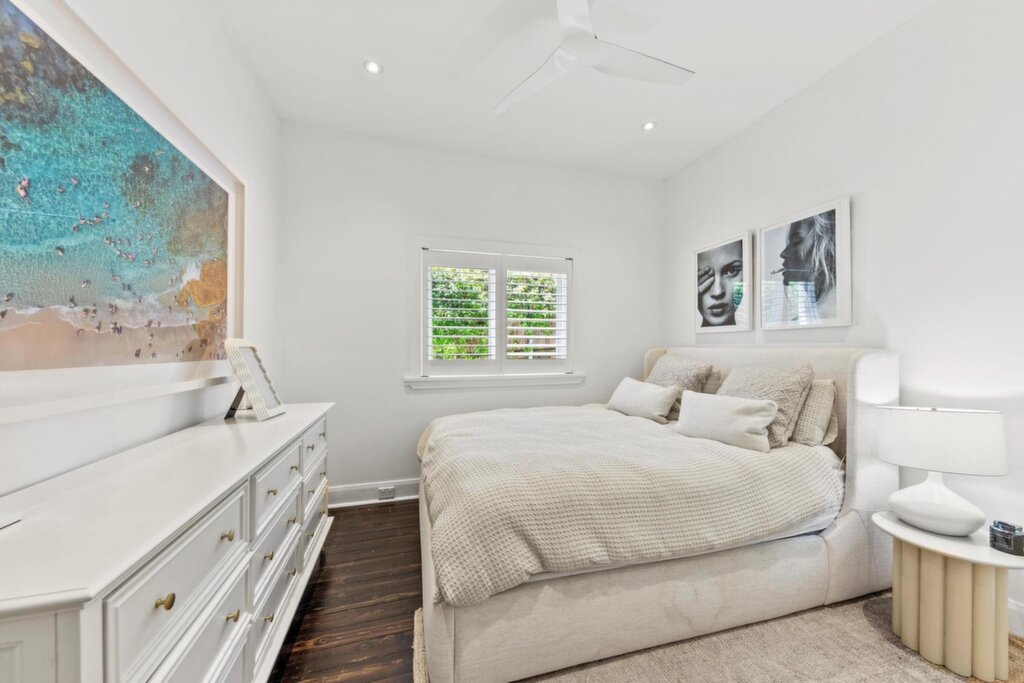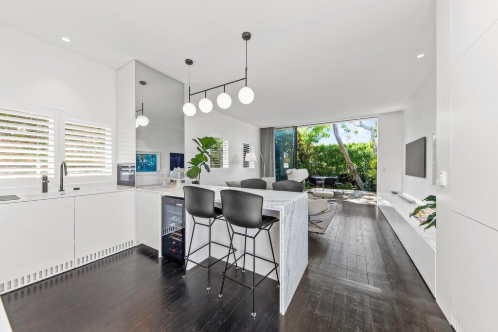 Three spacious bedrooms with custom built-ins, including a master suite with private ensuite and freestanding bath Gourmet kitchen featuring stone island bench, integrated fridge, double Bosch ovens, Zip tap with chilled, boiling & sparkling water, and designer lighting Expansive open-plan living with soaring 3m ceilings, dark timber floors, and floor-to-ceiling glass doors opening to a lush tropical garden Seamless indoor-outdoor flow to private entertaining deck with custom seating and outdoor shower Ducted air conditioning and skylight feature, and abundant natural light Large attic storage, internal laundry, and premium finishes throughout Prime north-facing corner position, moments from beaches, ocean walks, cafes, and schools