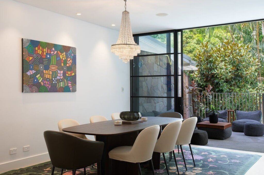 6 bedrooms + office, including a private parents' retreat and guest/library room 5 designer bathrooms with dual walk-in robes in main suites Spacious formal lounge with a cozy gas fireplace, open-plan family and dining zones that flow effortlessly to the outdoors, and a TV lounge with an underwater pool window for a unique feature Sleek island kitchen with butler's pantry and premium Miele appliances Steel-framed doors and large window connecting living spaces to terraces and gardens Magnesium pool and palm-framed decks, alfresco terrace with mid-century vibe, and outdoor pizza oven Lush tropical gardens, waterfall, and rainforest-inspired backyard Wine cellar with mood lighting and turntable Smart home technology, zoned air-conditioning, and hydronic underfloor heatingAbundant storage with custom built-ins and polished concrete floors Sustainable features including 6kW solar system, rainwater harvesting, and reclaimed materials